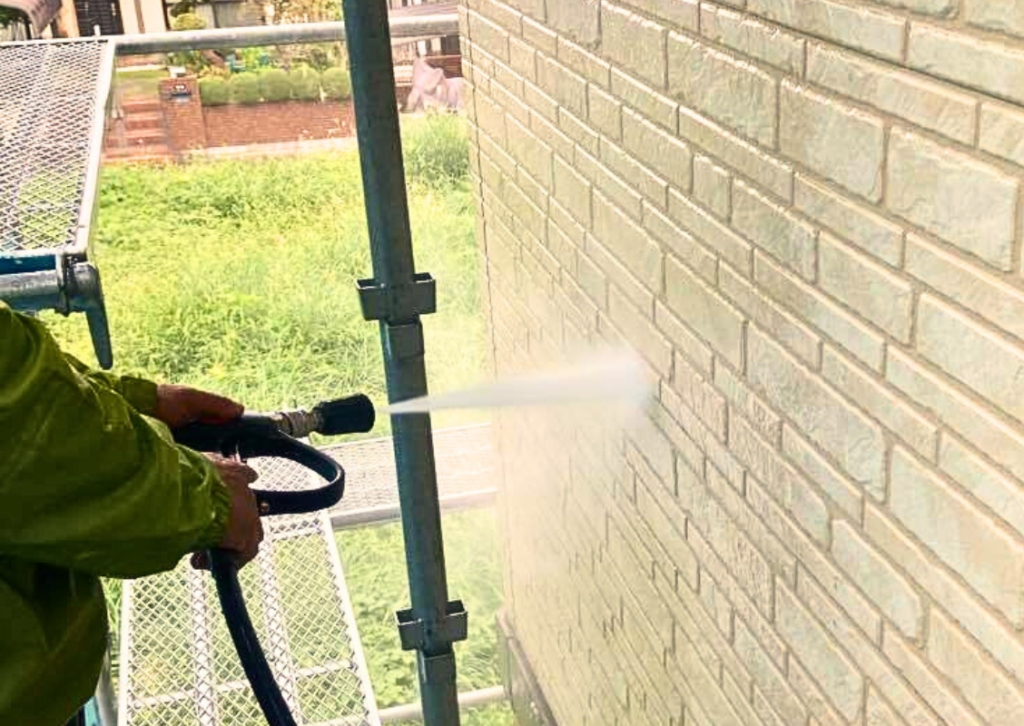 足場架設の次には、高圧洗浄を行います。高圧洗浄では、塗装をする前に、外壁についている汚れや不純物、特にコケやカビ、チョーキング現象によって浮き出た粉などをしっかり取り除き、塗装に適する塗布面に仕上げることが目的です。