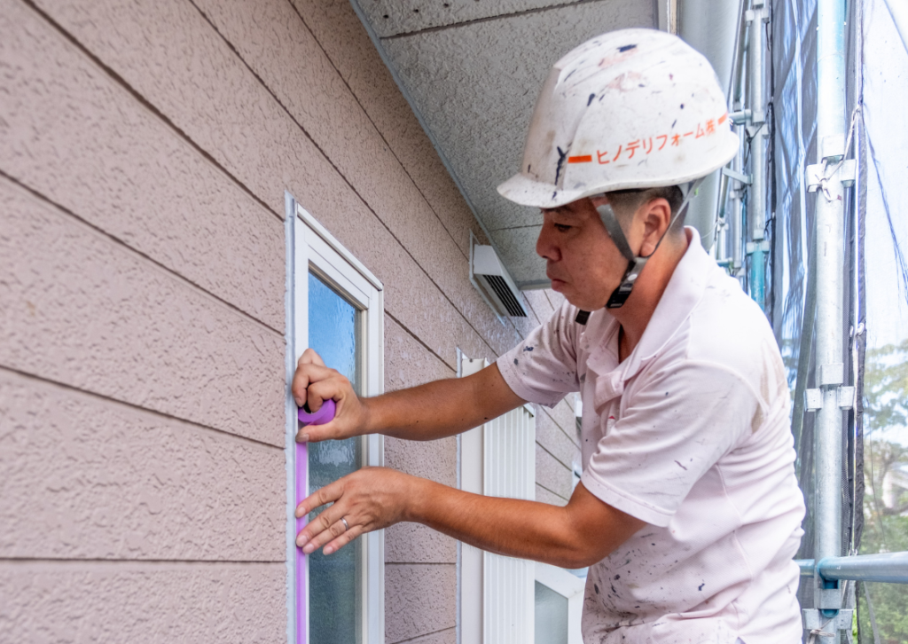 養生(ようじょう)とは、サッシや窓、エアコンのパイプ、ガスメーターや水道管など、塗る必要が無い部分をビニールで覆う作業のことを言います。