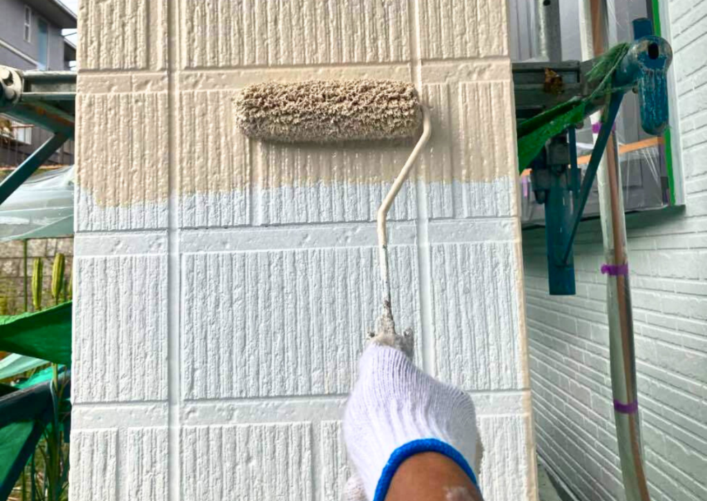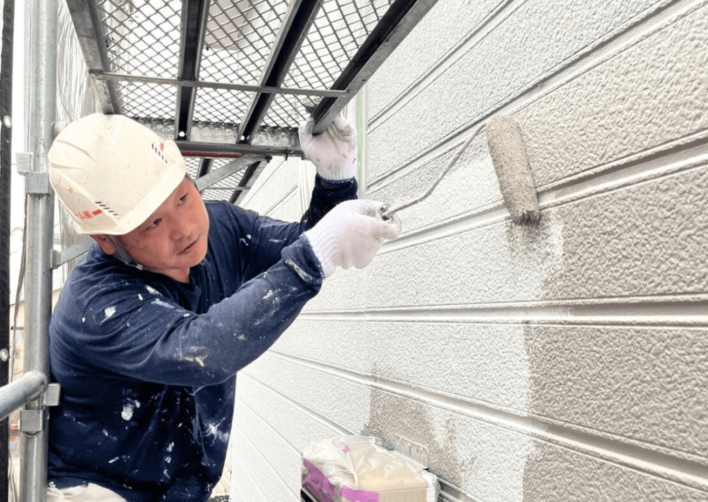 まずは下塗り。これは壁面と塗料をしっかりと付ける役割がある大切な工程です。壁面によって、それぞれに合った「下地強化材」を使用するのがポイントです。